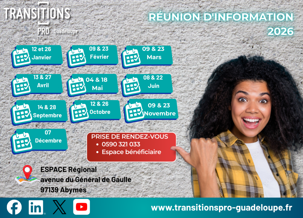 Transitions Pro Guadeloupe vous accueille lors de sa permanence aux Abymes pour vous informer, vous orienter et vous aider à construire un projet réaliste et sécurisé.